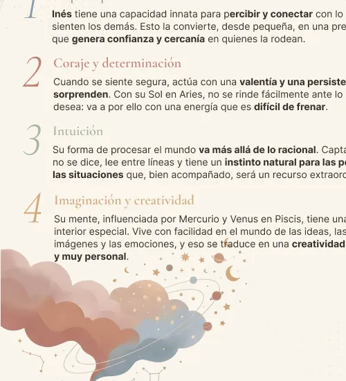 - Cada informe se calcula a partir de la carta astral exacta de tu bebé, usando la fecha, hora y coordenadas precisas de su nacimiento. Eso genera una combinación de posiciones planetarias irrepetible. El resultado es un texto que solo tiene sentido para tu hijo: por eso tantas familias nos dicen que se sienten identificadas desde la primera página.